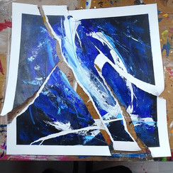 En enlevant du ruban de masquage sur une de mes œuvres , j’ai arraché accidentellement le papier. Ma création abîmée, j’ai fini par la mettre en pièce dans l’idée d’inclure de la feuille d’or dans les déchirures. Une nouvelle œuvre est née de cet incident et je l’ai nommé Faille .